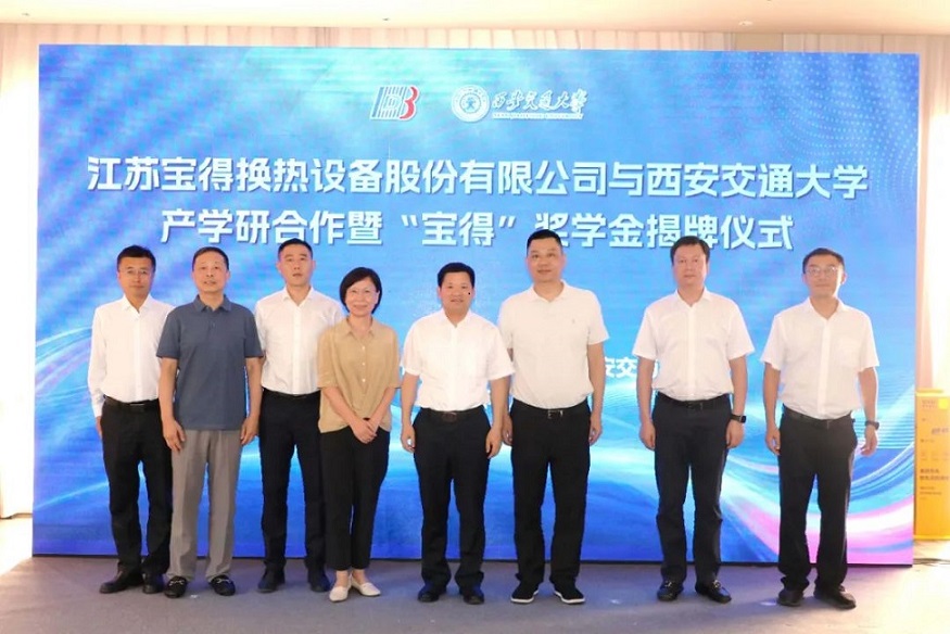 8月18日下午,江蘇寶得換熱設備股份有限公司與西安交通大學簽署產(chǎn)學研合作協(xié)議及“寶得”獎學金揭牌儀式在江陰成功舉行。
